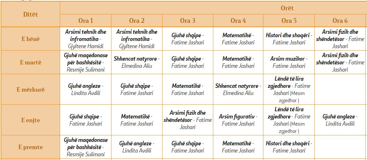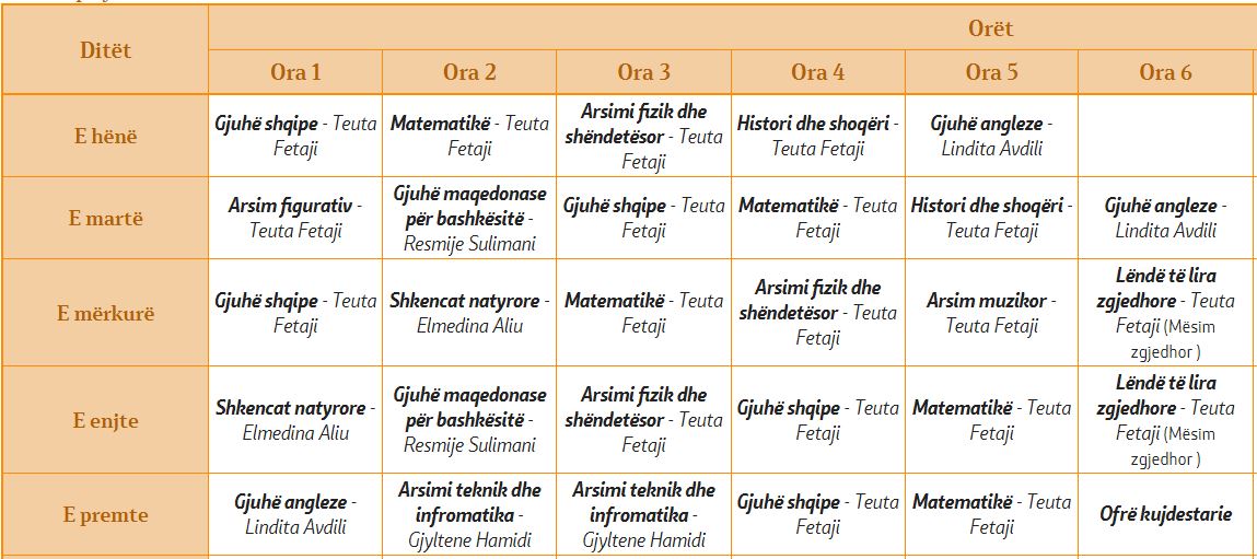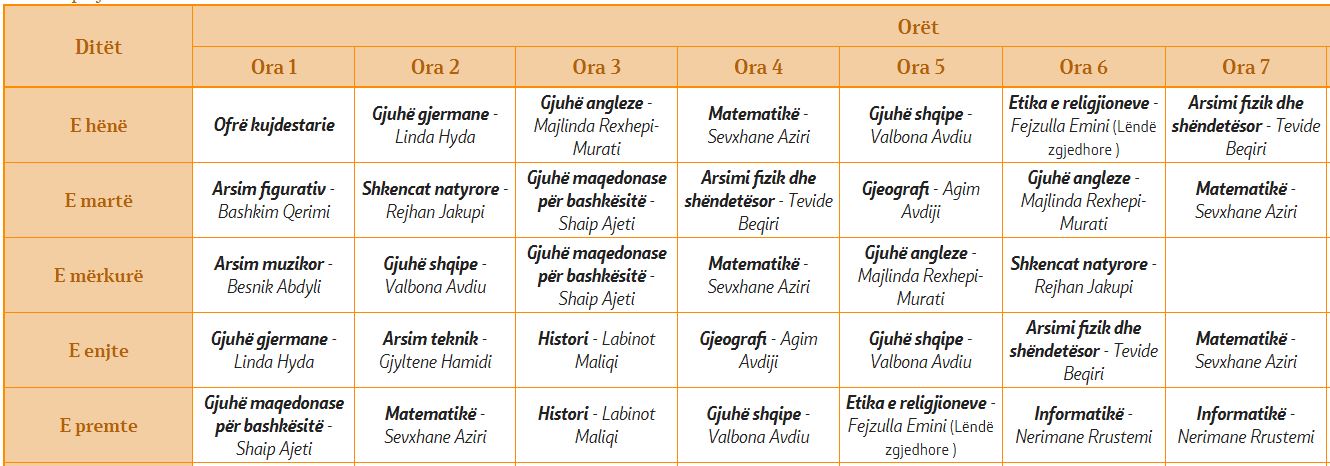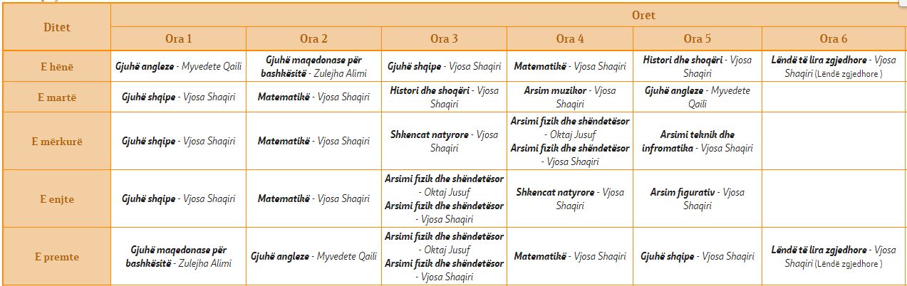 Oraret e klasave I-1 I-2 I-3 I-4 I-5 II-1 II-2 II-3 II-4 II-5 II-6 II-7 III-1 III-2 III-3 III-4 III-5 III-6 IV-1 IV-2 IV-3 IV-4 IV-5 IV-6 V-1 V-2 V-3 V-4 V-5 V-6 VI-1 VI-2 VI-3 VI-4 VI-5 VI-6 VII-1 VII-2 VII-3 VII-4 VII-5 VII-6 VIII-1 VIII-2 VIII-3 VIII-4 VIII-5 VIII-6